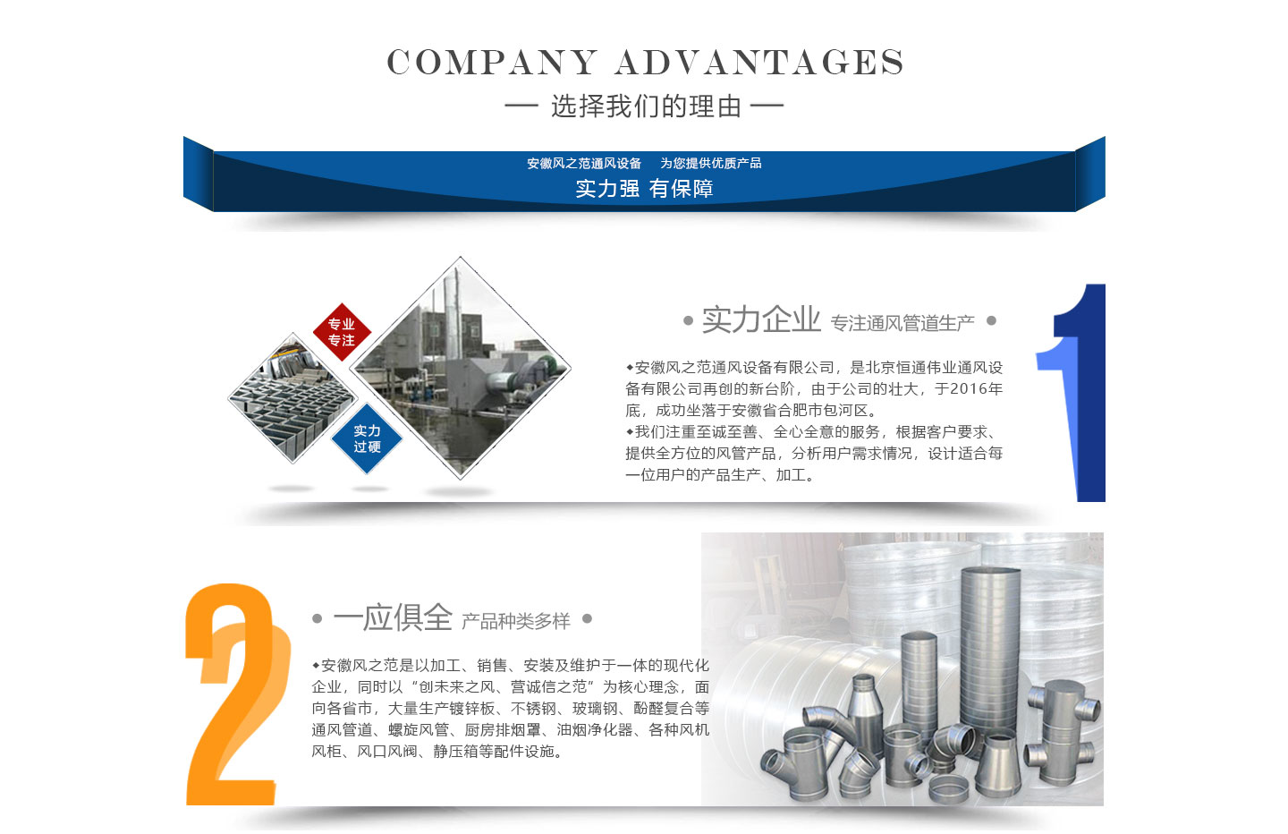 安徽風(fēng)之范通風(fēng)設(shè)備有限公司,是北京恒通偉業(yè)通風(fēng)設(shè)備有限公司再創(chuàng)的新臺(tái)階,多年來,公司員工憑著“誠(chéng)信敬業(yè)、團(tuán)結(jié)拼搏、勇于開拓、務(wù)實(shí)進(jìn)取”的企業(yè)精神,先后承接了多項(xiàng)重點(diǎn)工程項(xiàng)目,使公司健康穩(wěn)步發(fā)展。現(xiàn)由于公司的壯大,業(yè)務(wù)的拓展,又于2016年底,成功坐落于安徽省合肥市包河區(qū)。本公司生產(chǎn)設(shè)備精良,技術(shù)力量雄厚,質(zhì)保體系完善!讓用戶體驗(yàn)到,貼心的服務(wù),無(wú)憂的售后!風(fēng)之范是以加工、銷售、安裝及維護(hù)于一體的現(xiàn)代化企業(yè),同時(shí)以“創(chuàng)未來之風(fēng)、營(yíng)誠(chéng)信之范”為核心理念,面向全國(guó)各省市,大量生產(chǎn)鍍鋅板、不銹鋼、玻璃鋼、酚醛復(fù)合等通風(fēng)管道、螺旋風(fēng)管、廚房排煙罩、油煙凈化器、各種風(fēng)機(jī)風(fēng)柜、風(fēng)口風(fēng)閥、靜壓箱等配件設(shè)施。廣泛承接商場(chǎng)、工廠、酒店、寫字樓、地下室等,消防排煙工程、除塵凈化工程、室內(nèi)通風(fēng)工程、暖通空調(diào)工程、廚房排煙凈化工程。我們力求上進(jìn),追求,歡迎各界人士技術(shù)指導(dǎo),經(jīng)濟(jì)合作,共創(chuàng)美好明天!